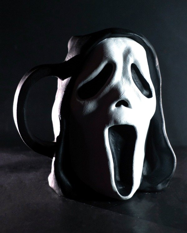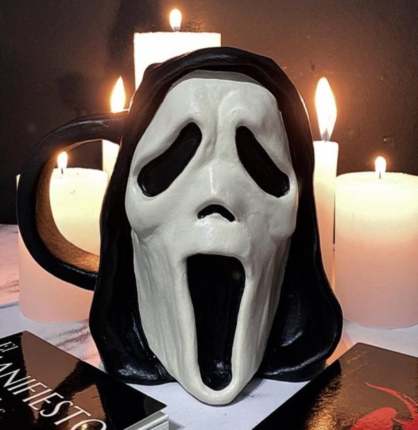 Inspirada en Ghostface de Scream, esta taza mezcla ironía, amenaza y juego psicológico. No es el monstruo: es la pregunta antes del grito. Cada sorbo se siente como una llamada que no deberías haber atendido.